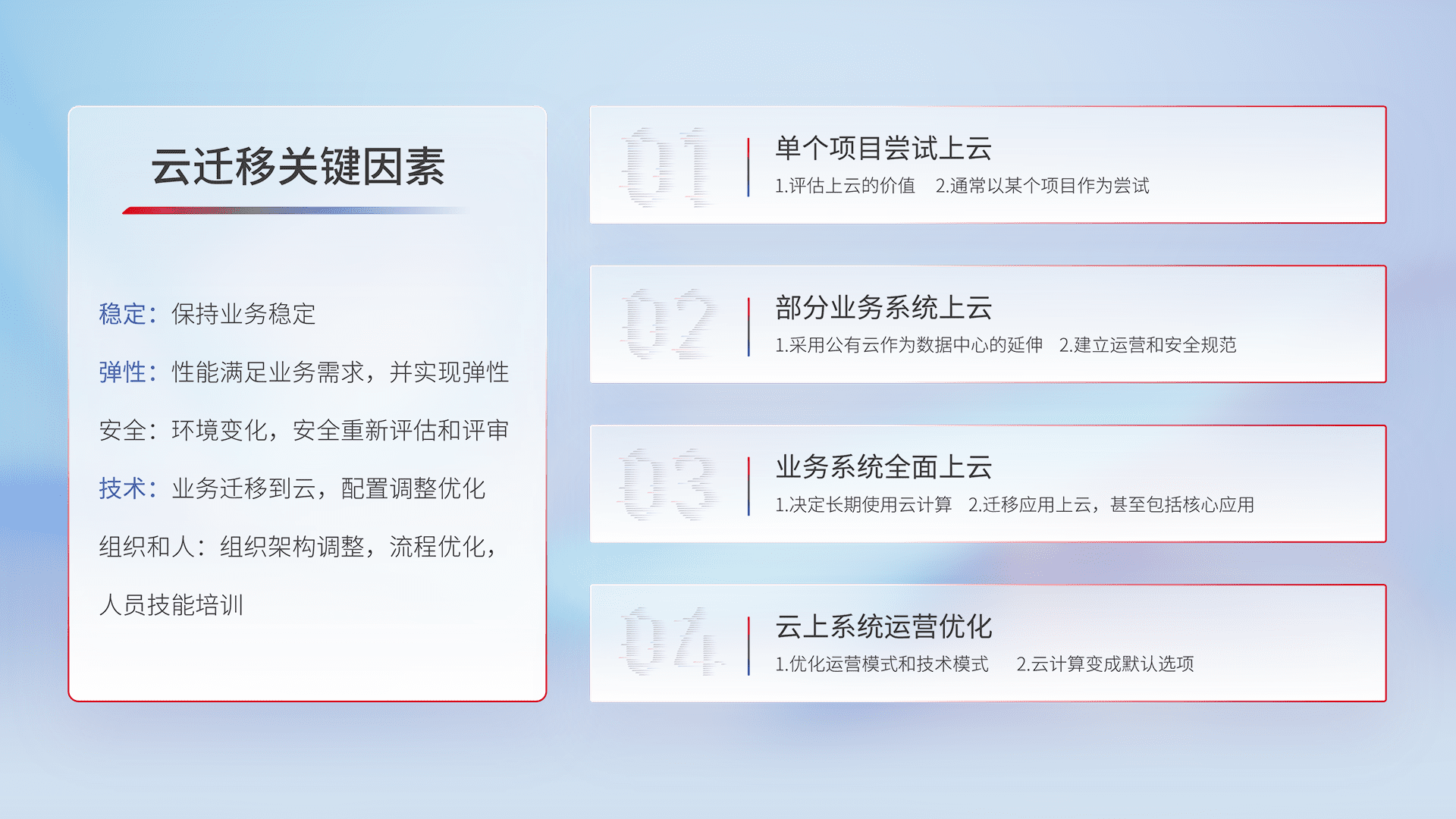 结合实际业务,,从规划设计、、、云平台选型、、、云原生改造、、、、数据迁移、、集成交付,,,,迁移全过程为客户识别最佳上云路径,,,做好风险识别管理,,,设计网络架构、、身份权限、、、、安全审计合规、、操作审计、、日志审计、、、、监控告警策略、、、多站点容灾设计等,,对云上基础设施进行整体规划,,,,提升IT治理水平,,,以满足弹性、、高可用、、高性能的需求。。