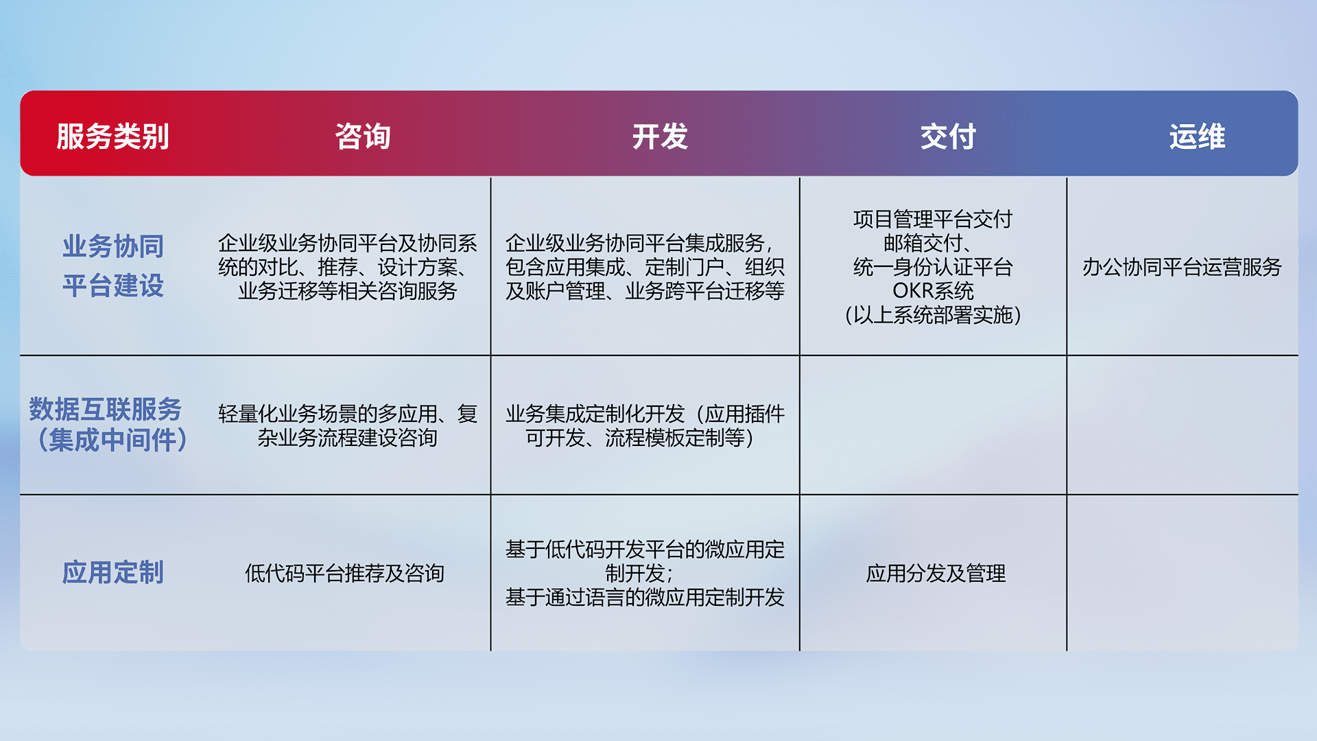 针对钉钉、、、、企微、、IDaas等平台级产品提供产品的规划、、、、方案、、、、交付、、、、定制化开发等服务,,,实现如统一协同办公、、、、智能客户服务、、、、混合会议管理、、智能数据查询、、等业务场景,,,实现数字化转型。。。